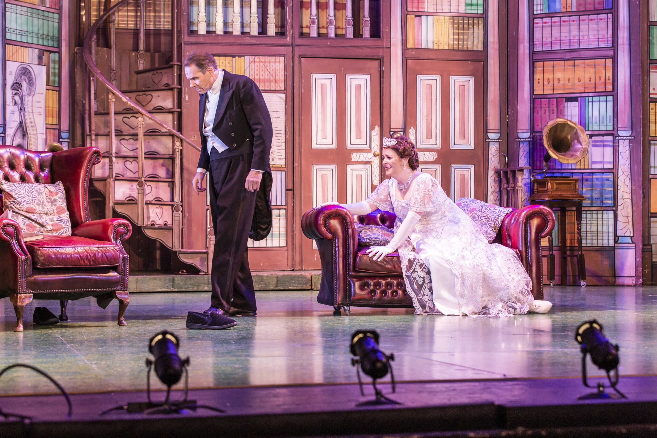 Higgins despondently visits his mother’s house, where he finds Eliza. Eliza declares she no longer needs Higgins (“Without You”). As Higgins walks home, he realizes he’s grown attached to Eliza (“I’ve Grown Accustomed to Her Face”). At home, he sentimentally reviews the recording he made the day Eliza first came to him for lessons, hearing his own harsh words. Eliza suddenly appears in his home. In suppressed joy at their reunion, Professor Higgins scoffs and asks, “Eliza, where the devil are my slippers?”